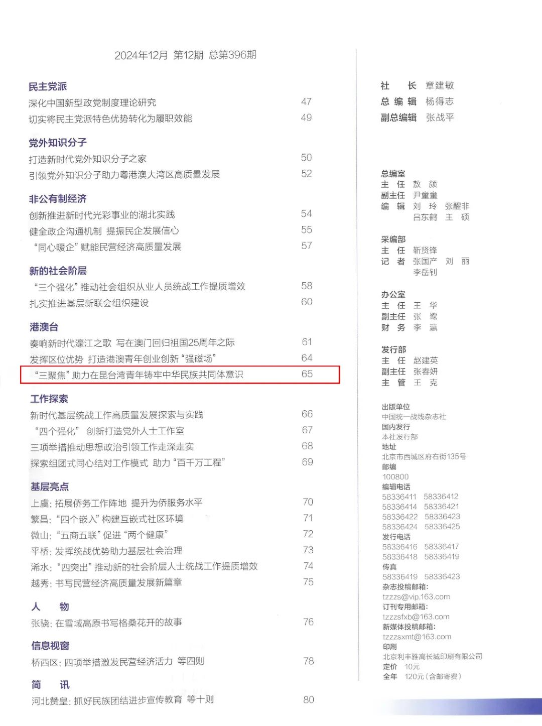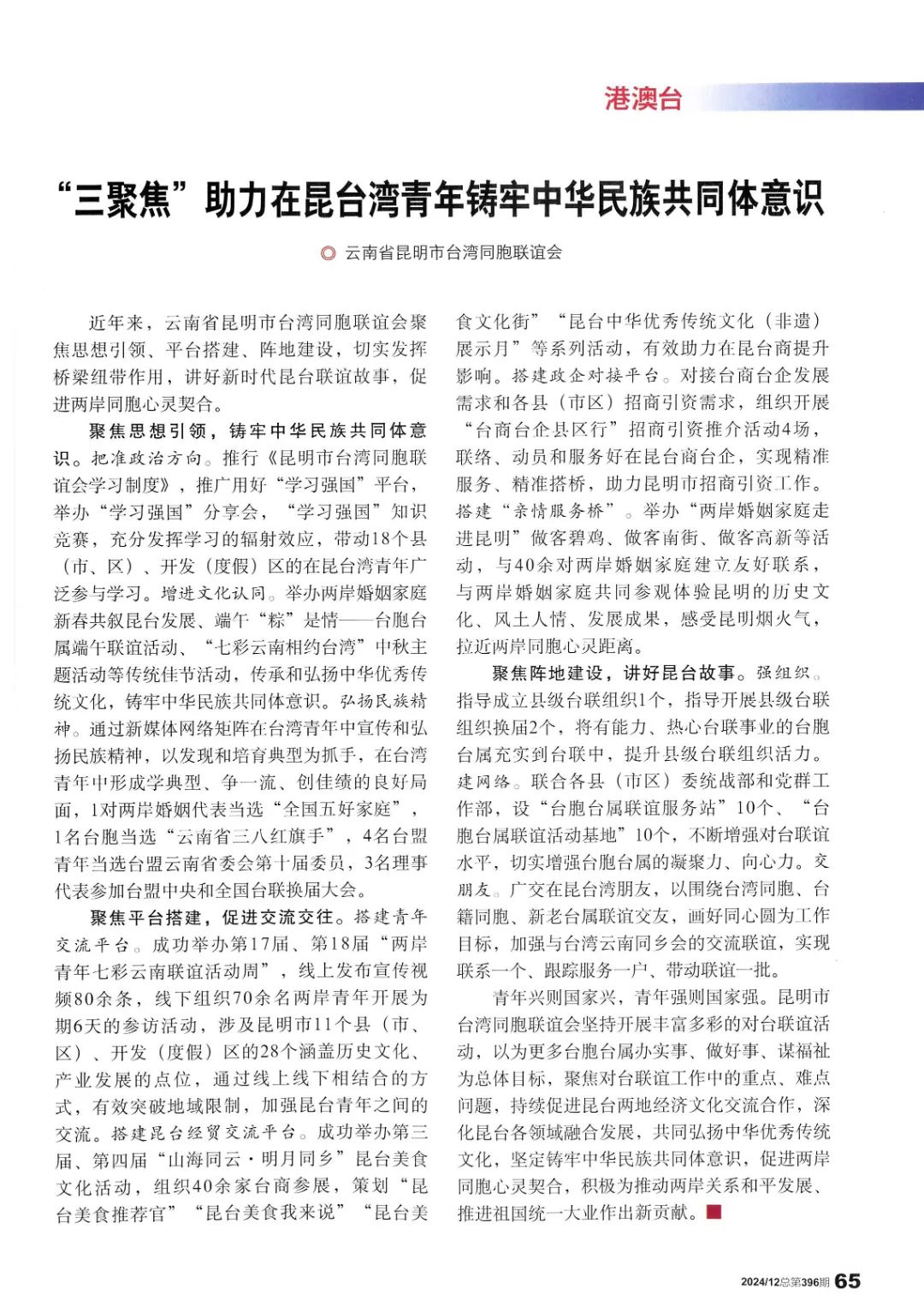 《中国统一战线》杂志2024年第12期刊登了昆明市台联文章《“三聚焦”助力在昆台湾青年铸牢中华民族共同体意识》。文章从三个方面介绍了市台联推动在昆台湾青年铸牢中华民族共同体意识工作的经验做法。全文如下: