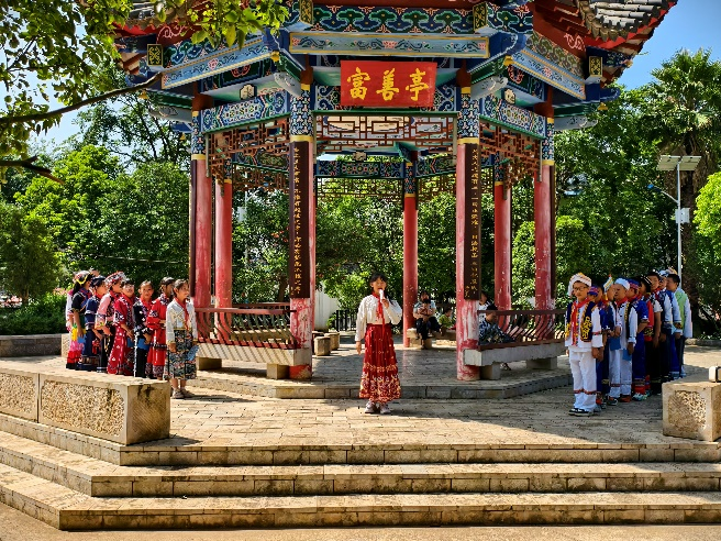 在老师们的带领下,学生们参观了观音山村白族特色民居。“原来这些白族民居有这么多的智慧呀!”在观音山社区党员讲解员和李老师的交替讲述中,学生们更加热爱自己生活的这片土地。两位老师结合小学《道德与法治》教材内容,围绕铸牢中华民族共同体意识的“大思政课”教育主题,充分挖掘课程资源和本土资源,从历史到现实,从各民族到中华民族,从校内课堂到校外社区,多维度呈现了“大思政课”的独特魅力。