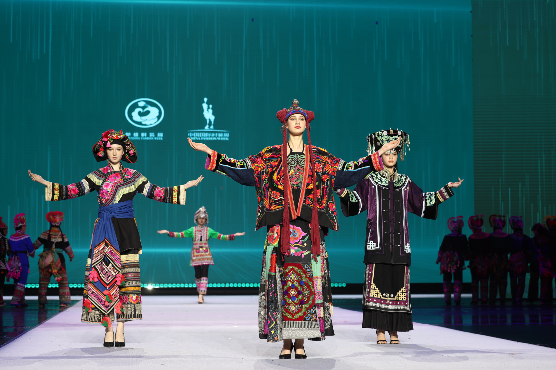 在各阶段的服装服饰展中,一件件融合非遗技艺与时尚设计于一体的服装服饰惊艳亮相。拥有厚重文化底蕴的楚雄彝绣别具一格,图案构思抽象、针法多样精致、配色大胆独特,每一件彝绣作品都是彝族文化的生动载体。云南各民族的服饰如调色盘上的浓墨重彩,哈尼族的靛蓝、白族的扎染、纳西族的披星戴月……不同民族的服饰风格各异,却共同晕染出“有一种叫云南的生活”的秀美图景。贵州苗族银饰缀满花鸟纹样,走动间流光溢彩;五指山黎锦以棉线织就山海、日月纹样,尽显热带风情;凉山州彝族披毡以羊毛手工缝制,靛蓝底色配红色纹样,尽显高原民族的豪迈……各地服饰各展其美,与云南各民族服饰共同勾勒出中华民族服饰的绚丽版图。不仅如此,此次盛会还汇聚了南亚、东南亚国家的特色服装,优雅迷人的越南奥黛、庄重大气的泰式传统服饰等一一亮相,充分展示了世界文明多样性,也生动印证了“民族的就是世界的”这一深刻理念。
