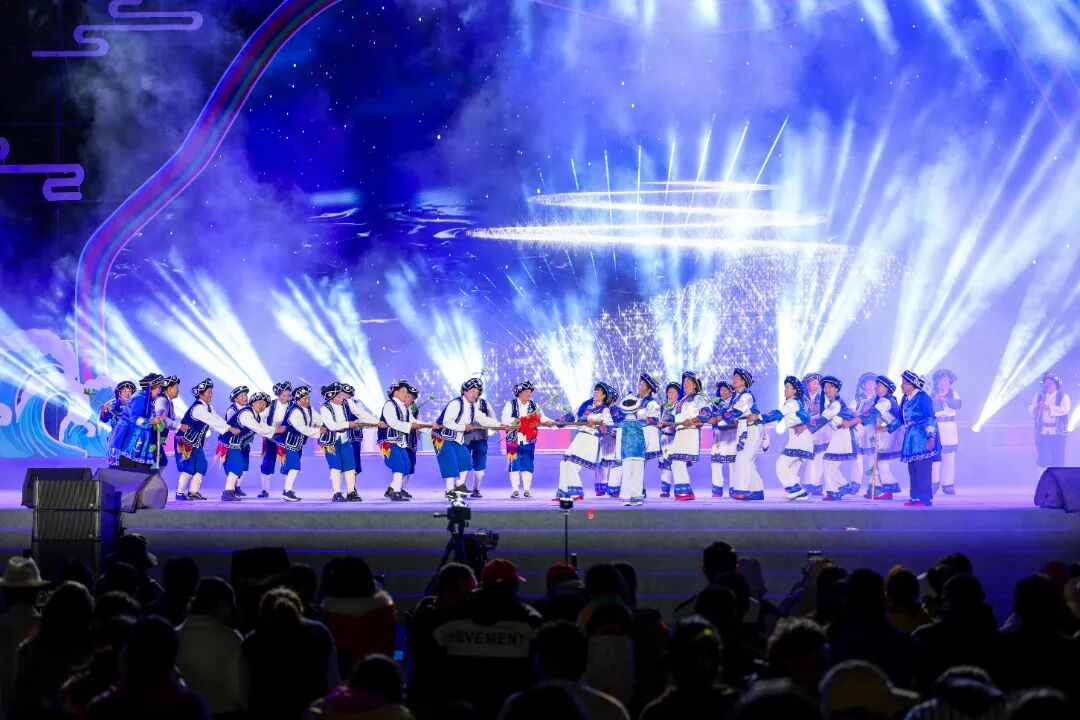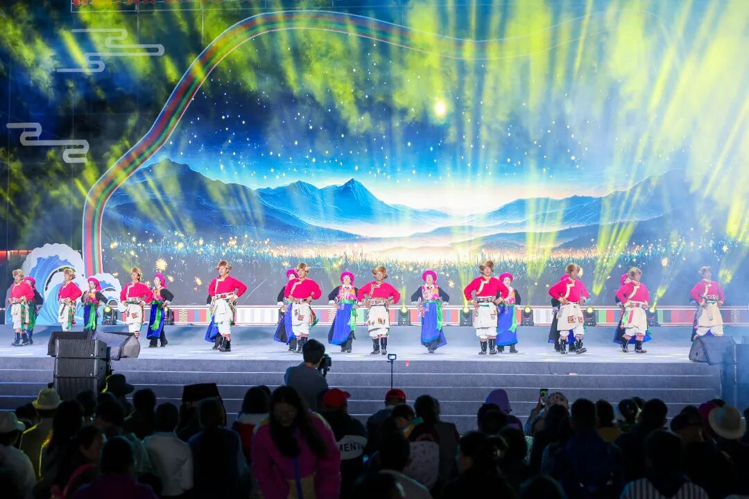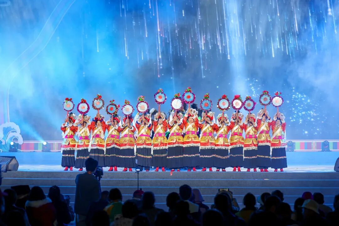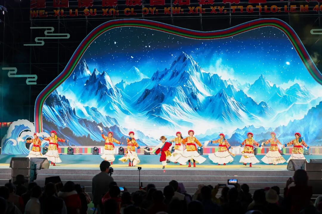 晚会在《三江同源·盛世华章》中拉开帷幕。傈僳族传统舞蹈《阿尺木刮》步伐铿锵、气势雄浑;纳西族祭祀古歌《阿勒古歌》音韵悠长,底蕴深厚;藏族舞蹈《塔城热巴》鼓声雷动、舞步飞扬,传递出对自然与生命的礼赞;《维西扬琴调》如流水潺潺,奔子栏的《幸福锅庄感党恩》祥和欢快,香格里拉锅庄舒展奔放,将整场演出推向高潮。演员们身着各民族传统服饰,纹饰精美、色彩斑斓,在灯光映照下更显文化厚重与艺术魅力,现场观众无不沉浸其中,感受到多元文化交融的温暖与美好。晚会以“时间的长河”为主线,呈现了迪庆各民族非物质文化遗产在新时代的传承与创新,彰显出“保护民族文化、传承中华文脉、促进民族团结”的深刻主题。