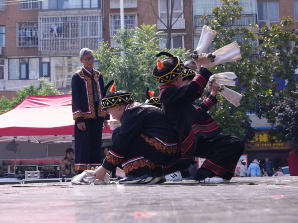 作为彝族聚居地流行的祭祀性男性四人舞蹈,《喀红呗》以“跩脚步”“甩铃步”等十几种舞步,模拟羊角碰角、老鹰展翅等禽兽动作,由多个特色舞段组成,承载着彝族群众的文化记忆与情感表达。镇雄县将这一独特非遗融入公共文化场景,在雄腾广场、大古里欢乐城等人群较为集中的广场景区进行展演活动,让各族群众与游客直观感受彝族文化的魅力,成为民族文化交流的鲜活载体。