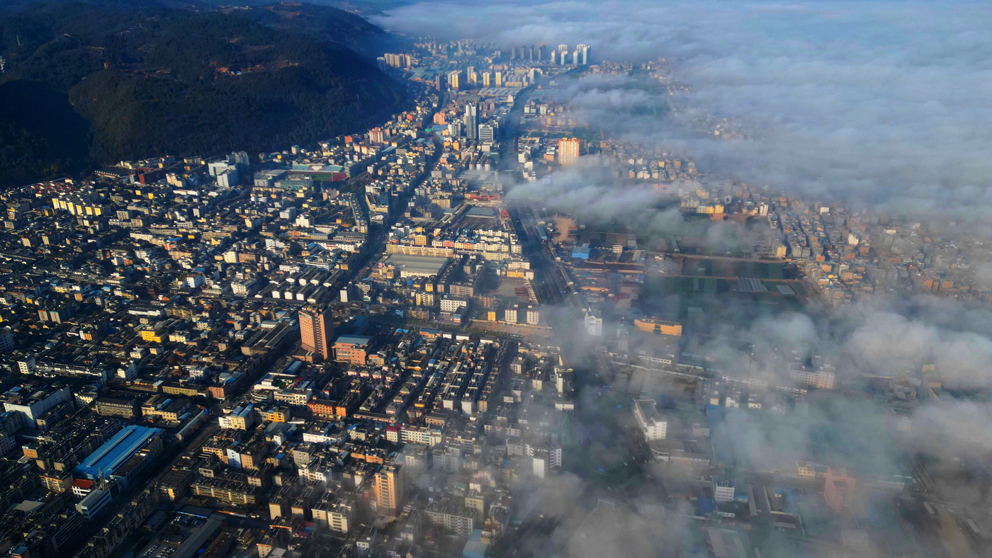 登临秀山,通海“山城田湖”的空间格局清晰可见,古城街巷肌理依然保存完好。