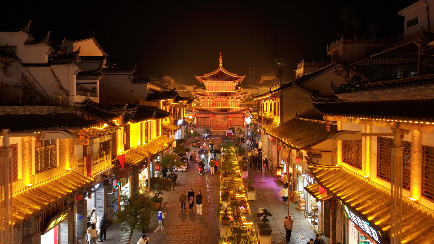 如今漫步通海古城,青石板路串联起一座座修复一新的民居,入夜时分,它们点亮了城市的上空,古城风貌已初显魅力。