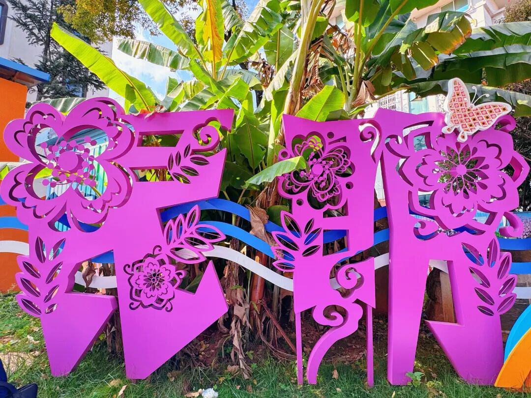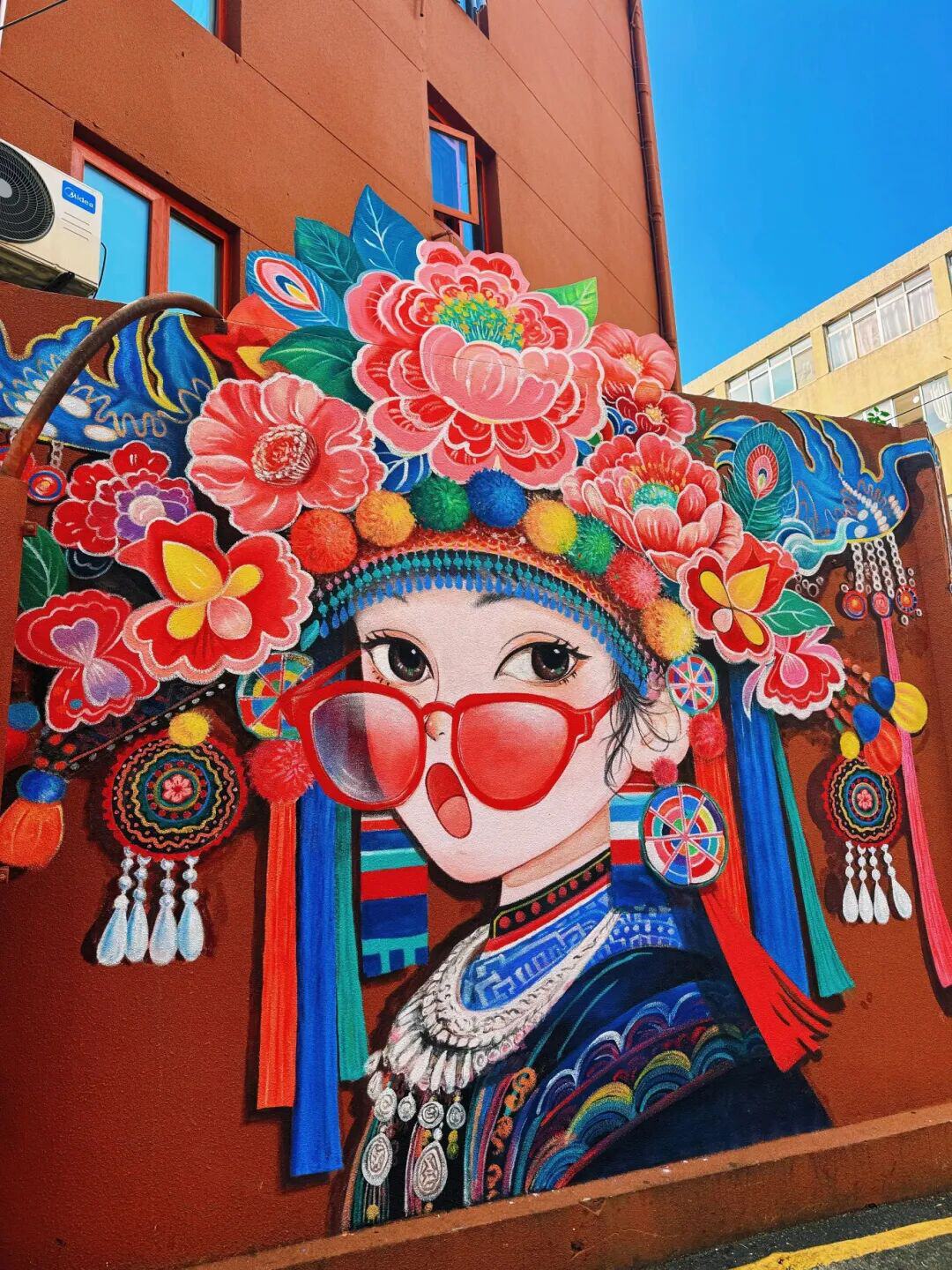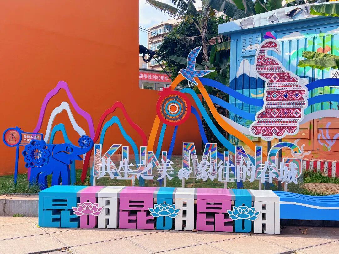 设计团队将彝族虎纹刺绣、白族甲马雕版等非遗元素,与象征团结的石榴纹、孔雀、大象及春城花卉等意象创新融合。精心创作的“共生之美 象征的春城”系列艺术造型和大型墙绘,融合剪纸艺术与现代审美,成为河岸线上一处兼具民族特色与时尚气息的文化地标。