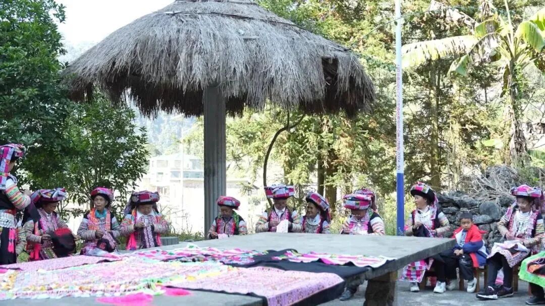 “绣花喽!”一声清脆吆喝划破银厂村的宁静,村民活动中心的坪子上很快聚集起十余位“角瑶”妇女。她们指尖丝线灵动穿梭,针线摩擦的细微声响与阵阵欢声笑语交织回荡。