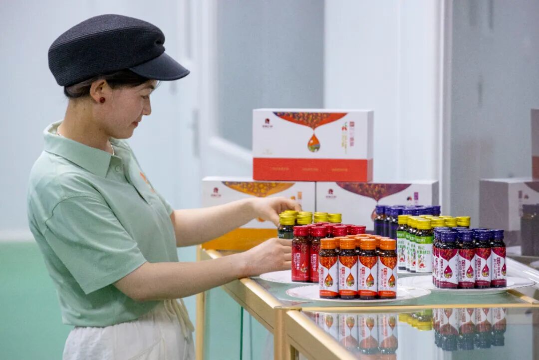 6月20日,在宁夏同心县河西镇一家枸杞企业,工作人员展示枸杞深加工产品。近年来,河西镇依托当地三条引黄干渠灌溉网络,流转土地发展枸杞种植,通过龙头企业带动的方式发展枸杞深加工,产品深受国内外消费者喜爱。新华社记者 杨植森 摄