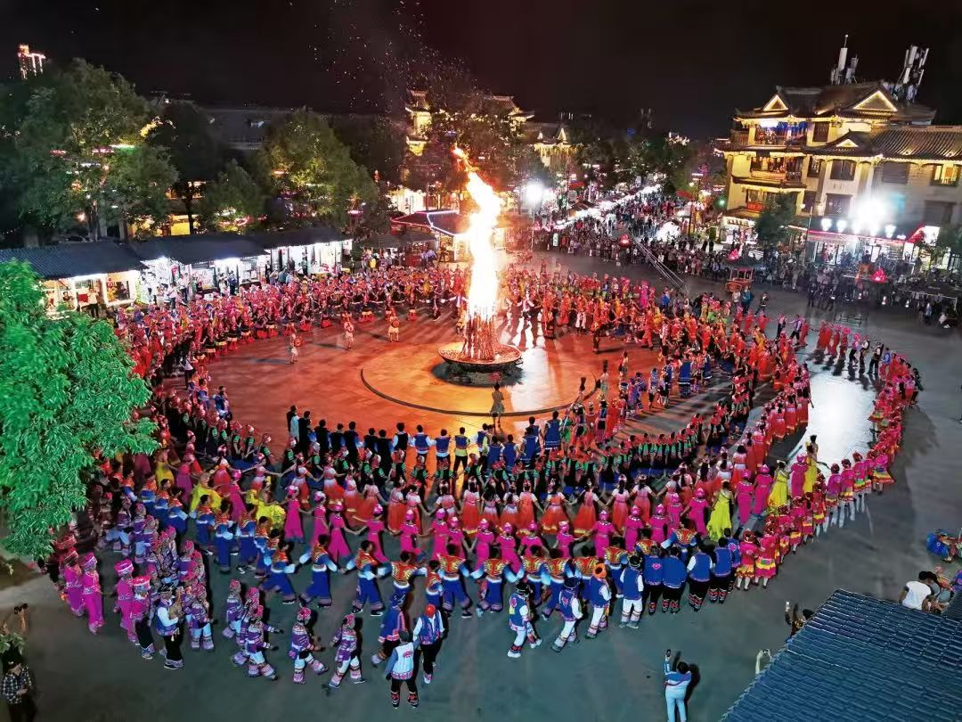 楚雄州各族群众在彝人古镇景区欢歌载舞、其乐融融