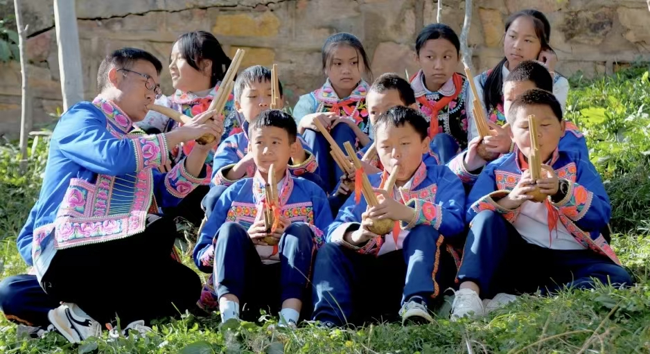各族青少年传承学习非物质文化遗产——芦笙演奏。