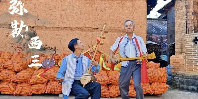 年近古稀的国家级非物质文化遗产阿细跳月传承人段正荣,精神抖擞地拉着三胡,弥勒市市级非物质文化遗产阿细跳月传承人寇正荣也弹起大三弦和声。