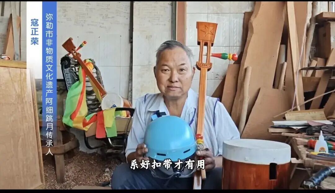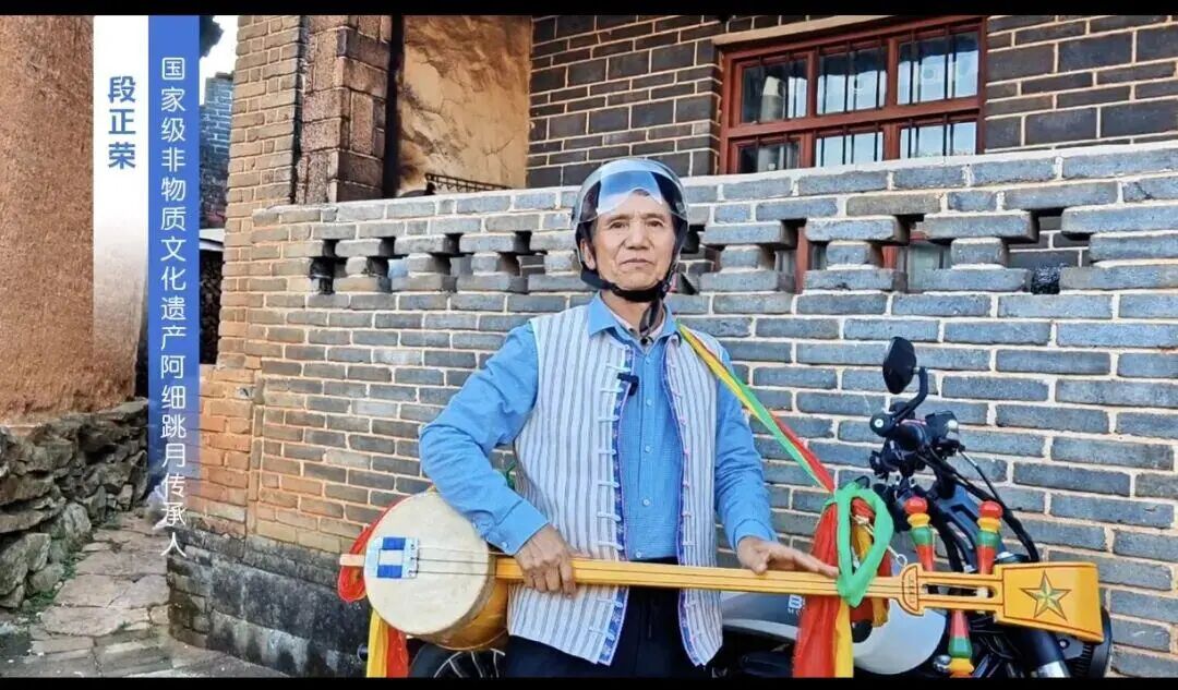 一曲奏毕,段老抚了抚怀中的三胡,笑着打开了话匣子:“作为一名阿细跳月传承人,三胡是我每天出门的‘标配’,骑乘摩托车、电动车,戴上安全头盔是安全的‘标配’!”他坦言,早些年村里不少年轻人骑摩托串寨跳月,嫌戴头盔麻烦,总抱着侥幸心理,多次发生因骑车未戴头盔引发的意外。