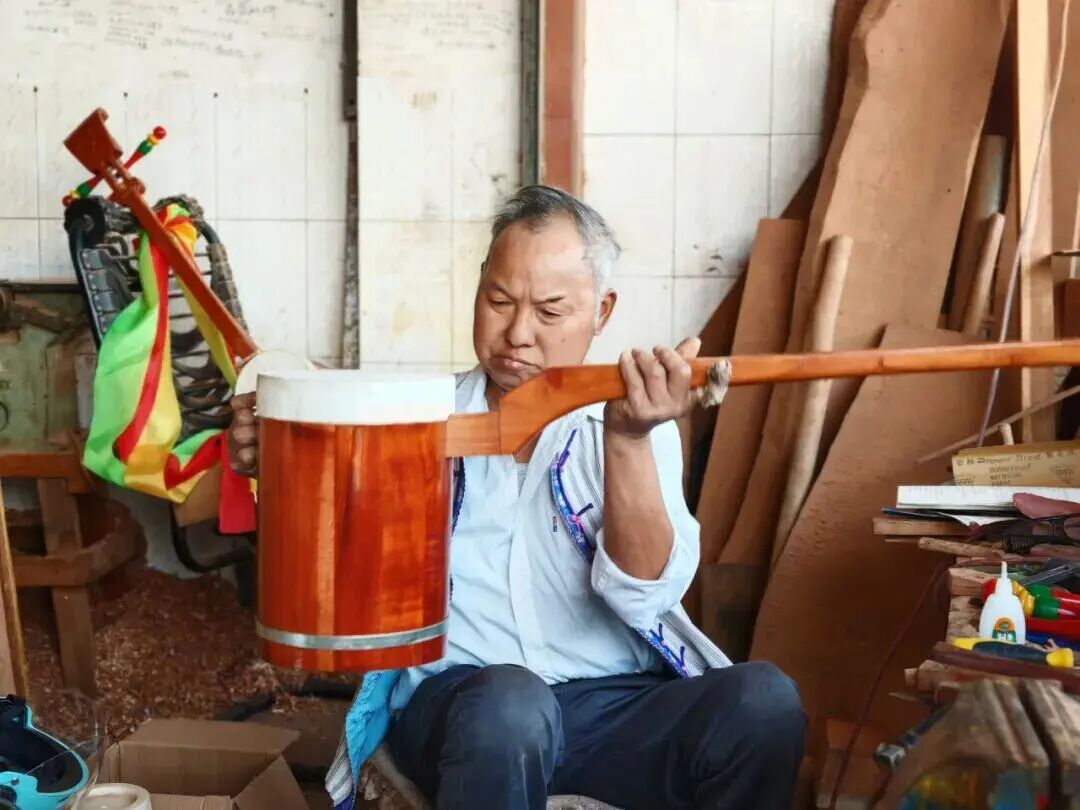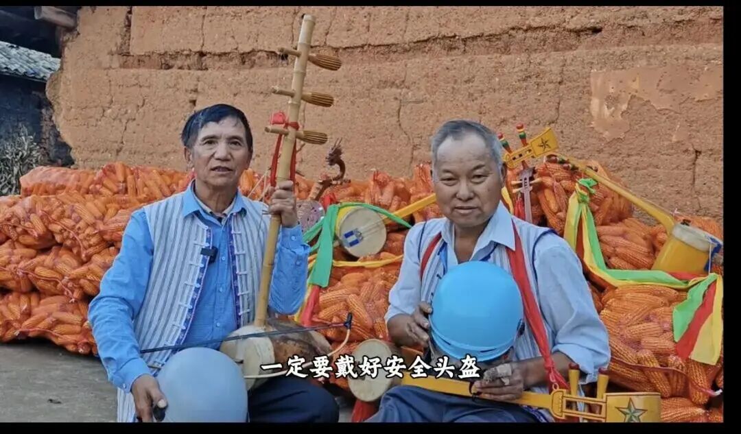 一旁的市级非物质文化遗产阿细大三弦制作匠人寇正荣,也搭起了话。这位与大三弦打了四十多年交道的老匠人,一边熟练的拉锯、挫料、打卯榫,制作着大三弦,一边说道:“一把做工精良的大三弦,要牢固扎实才耐用,戴安全头盔,要系好扣带才有用!”他以制琴作比,句句实在,“弦轴没拧牢,琴声就会走调;头盔扣带没系紧,遇上意外就形同虚设。咱们阿细人做事讲究实打实,戴头盔这件事,可不能马虎!”