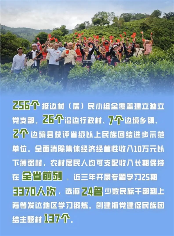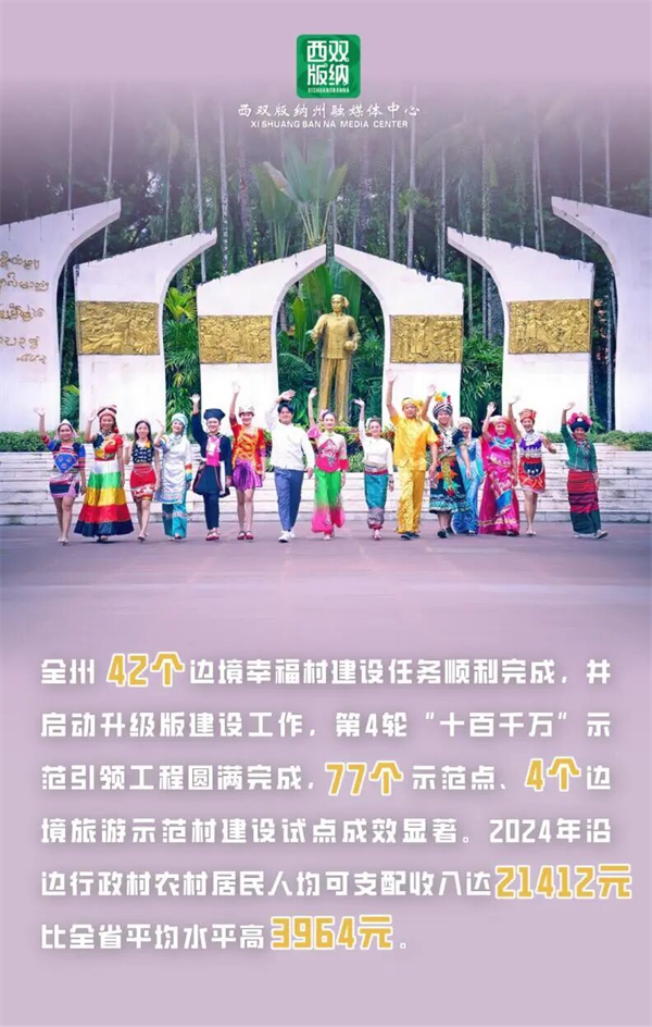 率先在全省建成边疆特产销全国(西双版纳)展销中心,为经济高质量发展注入新动能。2024年沿边行政村农村居民人均可支配收入21412元,比全省平均水平高3962元,边民富、边关美、边境稳、边防固的良好局面进一步呈现。