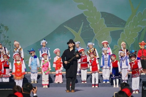 白族调非遗代表性传承人李宝妹、傈僳族歌手阿普萨萨等携原创春联登台,用欢歌热舞点燃全场。音乐人赵照带着剑川楹联学堂的孩子们,将《声律启蒙》和白族童谣《月亮谣》混编在一起,台下许多人轻声跟唱。