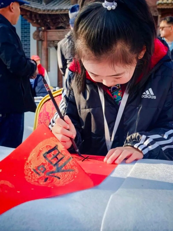 现场专门设了写春联专区,书法家们铺开红纸、挥毫泼墨,不到半小时送出上千副福字、春联。身着白族服装的男女老少和来自全国各地的观众,手举春联,汇成一片喜庆的联海。