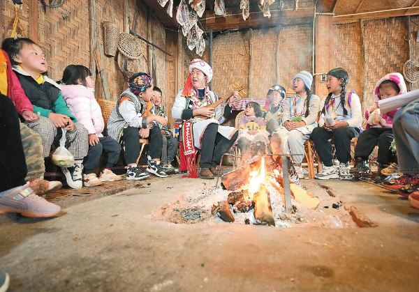 郁伍林(中)传授怒族传统文化知识。
