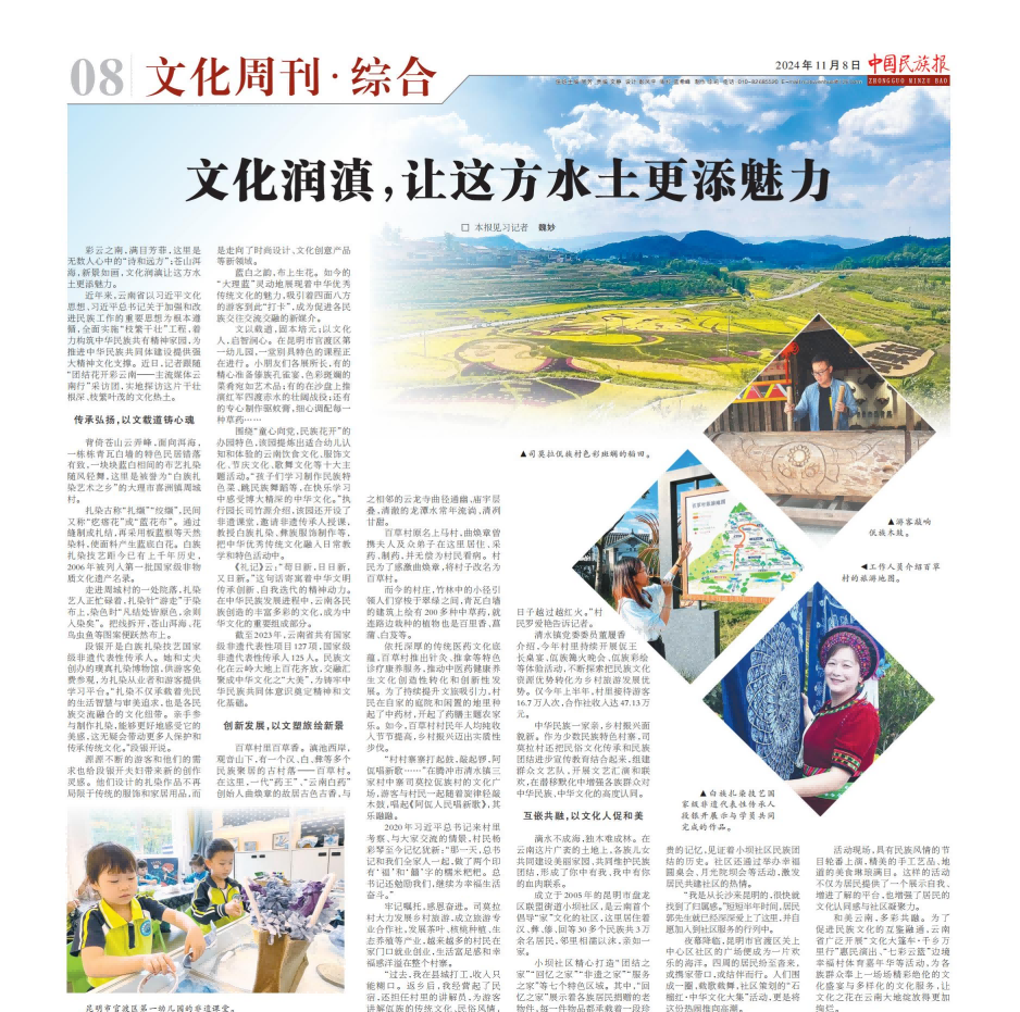 11月8日,中国民族报发文《文化润滇,让这方水土更添魅力》,文章围绕今年“团结花开彩云南——主流媒体云南行”采访团到过的大理州、昆明市、保山市,以点带面,聚焦云南省以习近平文化思想、习近平总书记关于加强和改进民族工作的重要思想为根本遵循,全面实施“枝繁干壮”工程,着力构筑中华民族共有精神家园,为推进中华民族共同体建设提供强大精神文化支撑。