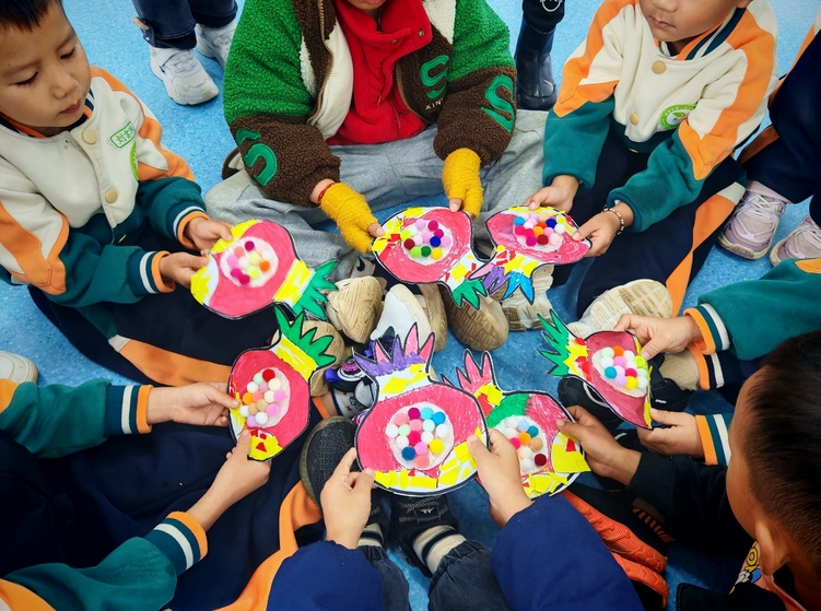 在活动开始前,老师向孩子们详细讲解了石榴的象征意义——它外形浑圆,内部则蕴藏着无数紧密相连的石榴籽,寓意团结与和谐。老师提问道:“如果我们中一班是一颗石榴,你们又是什么呢?”孩子们兴致盎然地回答道:“我们是石榴籽!”这一形象的比喻让他们对即将开始的手工活动充满了期待。