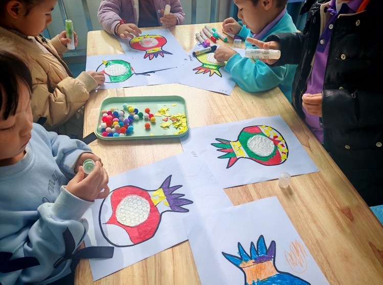活动伊始,孩子们被分成若干小组,并分发了一堆彩色纸片和胶水,他们的任务是合作制作一个个栩栩如生的“石榴”。活动中,孩子们分工合作,有的负责剪裁纸片,有的负责粘贴,还有的负责设计石榴的外形。整个过程中,他们互帮互助,完美诠释了民族团结的力量。