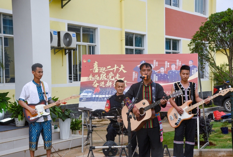 “一生坚守斗志昂扬,警徽闪烁着光芒。警笛长鸣守护一方,是我青春最好模样。我们来自四面八方,有着共同的梦想……”晚风习习的南汀河畔,临沧市军赛边境检查站的民警和镇康县军赛民族乡民族群众共同组建的乐队正在开展警民联欢活动。