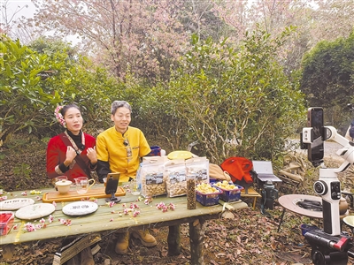 在通了5G网络的普洱市景迈山上,玉班(左)和丈夫在直播售卖自家生产的茶叶。 本报记者 丛蓉摄