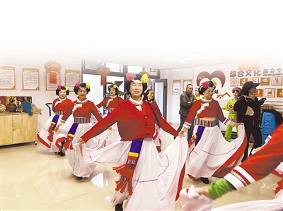 大理市三和社区居民在活动中心跳舞。
