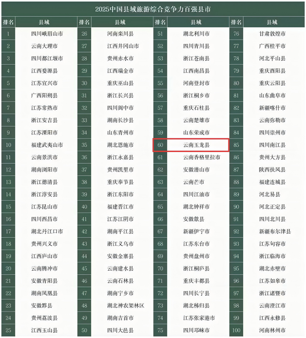 近日,竞争力智库、北京中新城市规划设计研究院等机构在北京联合发布《中国县域旅游竞争力报告2025》,揭晓了备受瞩目的2025中国县域旅游综合竞争力百强县市名单,玉龙县凭借其丰富的旅游资源、活跃的旅游经济及有力的政府推动等优势,成功上榜,在全国县域旅游竞争格局中崭露头角。