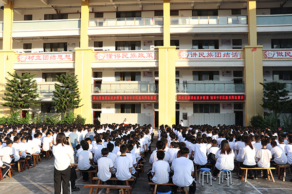 作为云南省铸牢中华民族共同体意识教育示范学校,军赛中学将民族团结教育贯穿思政课堂:从云岭讲师团的专题讲座,到班级每周的“民族团结主题班会”,再到法治副校长、校长主讲的“开学思政第一课”,学校通过鲜活案例和互动实践,引导学生深刻理解“三个离不开”“五个认同”的内涵。