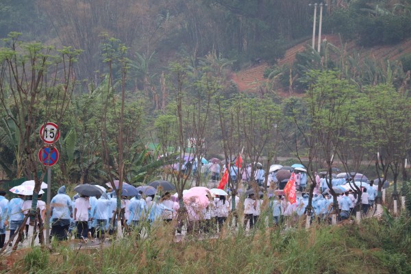课堂上的故事在心中发芽,课堂外的行走也让情感扎根。清晨七点半,南伞口岸站满了490多名师生,大家校服整齐,列队肃立。这是县委教育工委组织的“徒步边境线,传承戍边情,共筑强国梦”主题活动。看着国旗缓缓升起,学生们心中涌起对祖国的热爱。升旗结束后,大家开始冒雨徒步巡边。