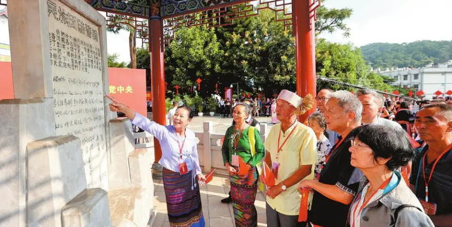▲普洱民族团结誓词碑盟誓代表后代参观民族团结誓词碑。图片来源:云南网