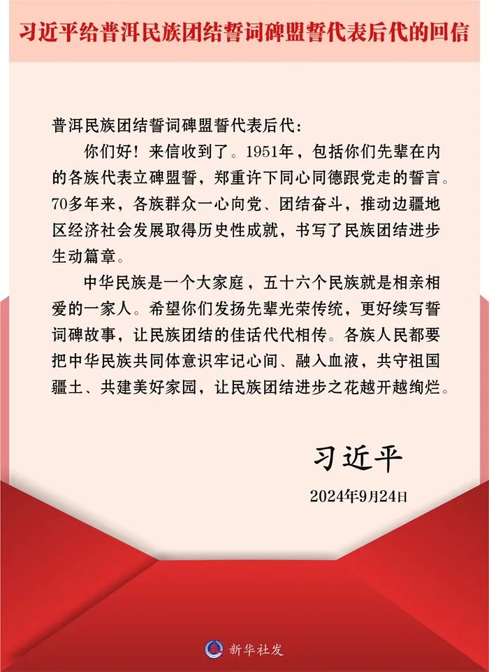 ——习近平总书记2024年9月24日给普洱民族团结誓词碑盟誓代表后代的回信